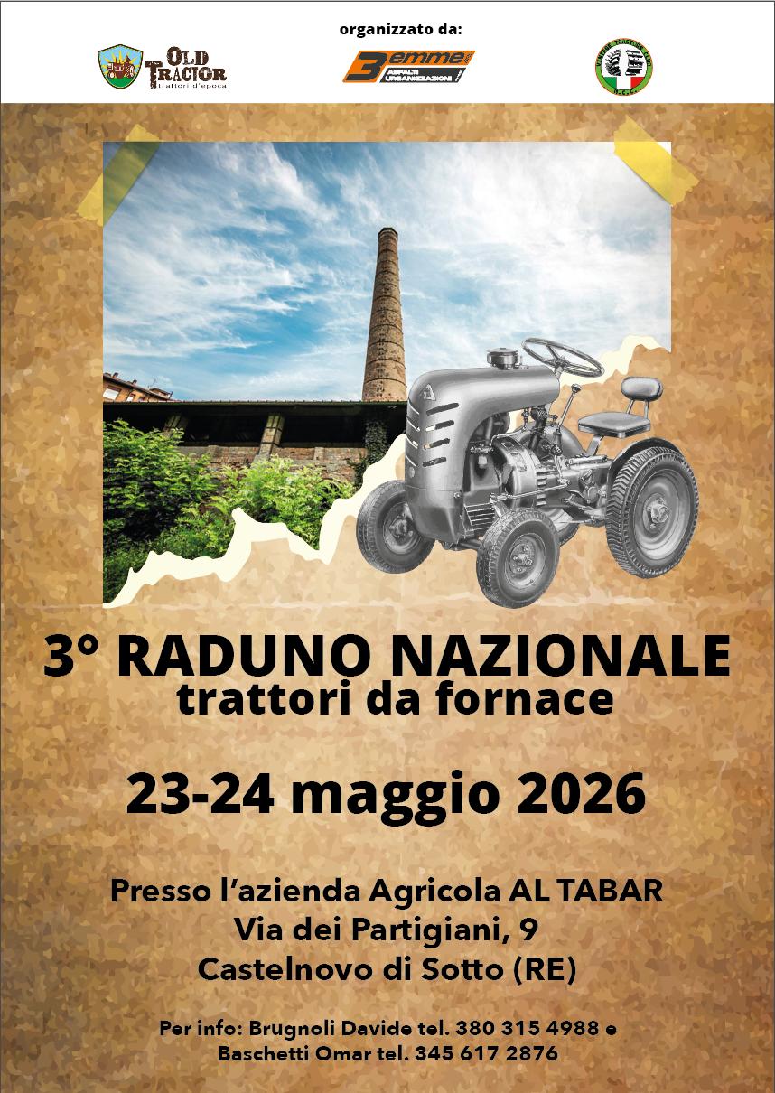 Il 23-24 maggio presso l’azienda agricola Tabar di Castelnovo di Sotto (Re) si terrà il terzo raduno nazionale di trattori da fornace organizzato da Old Tractor e Vintage Tractor Club in collaborazione con 3Emme Asfalti Urbanizzazione.